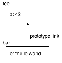 The a property doesn’t actually exist on the bar object, but because bar is prototype-linked to foo, JavaScript automatically falls back to looking for a on the foo object, where it’s found.